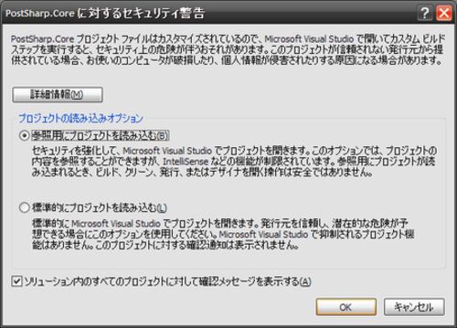 PostSharp(http://doc.postsharp.org/)の下調べのためにPostSharpを自分でビルドしてみようと思い、ソースコードをダウンロードしてVisual Studio 2005でプロジェクトを開こうとするとダイアログが表示された。 なるほど、標準のビルドタスクが変更されてい…